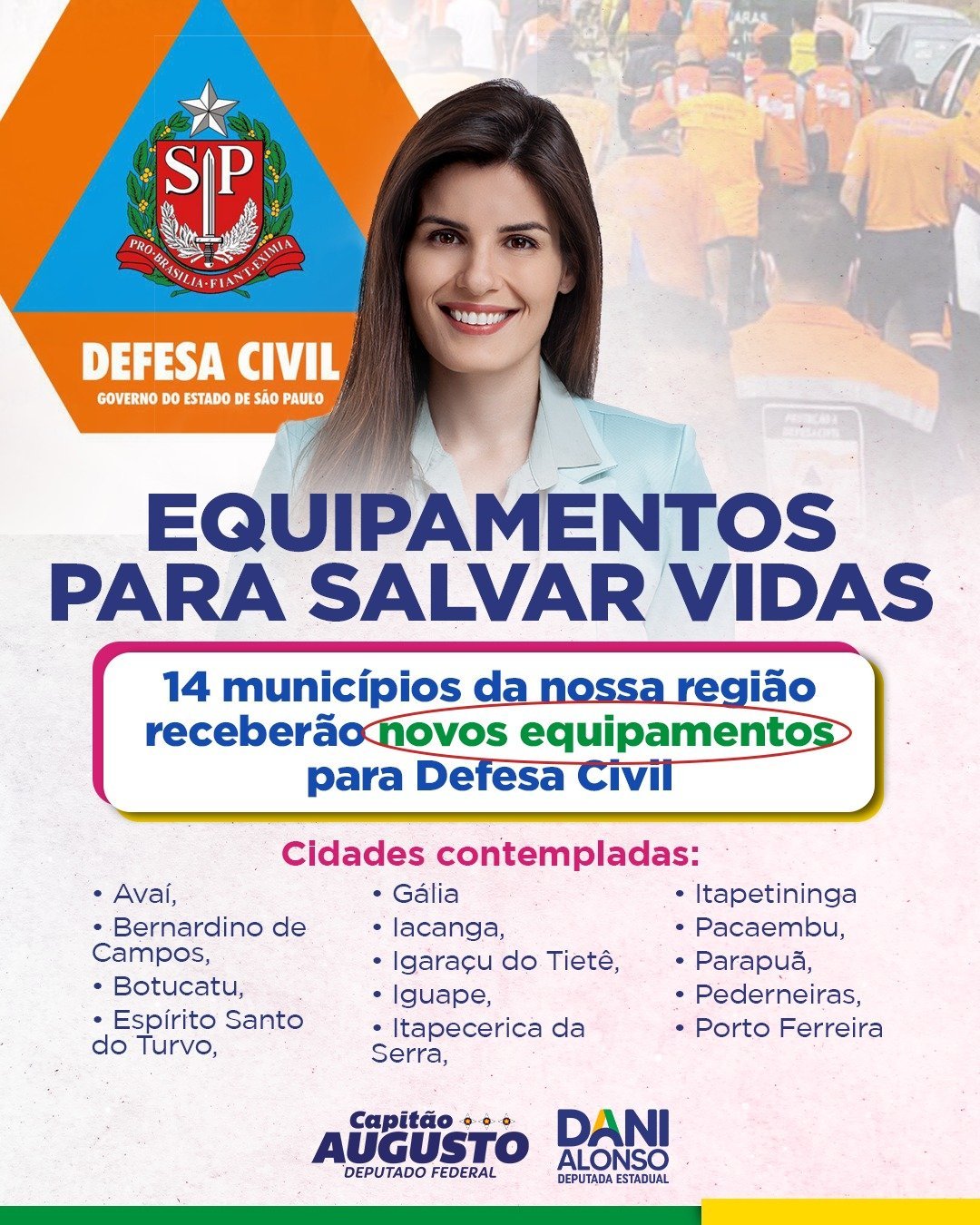 Mais de 14 municípios serão contemplados com novos equipamentos para a Defesa Civil, visando salvar vidas em momentos críticos. Entre as cidades que serão beneficiadas estão: Avaí, Bernardino de Campos, Botucatu, Espírito Santo do Turvo, Gália, Iacanga, Igaraçu do Tietê, Iguape, Itapecerica da Serra, Itapetininga, Pacaembu, Parapuã, Pederneiras e Porto Ferreira.