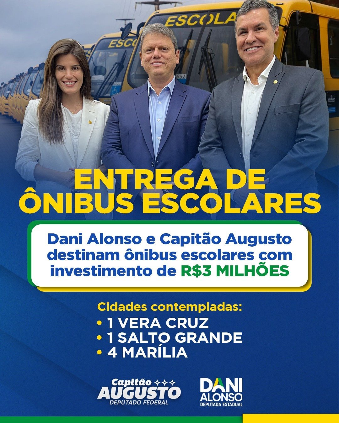 A Deputada Estadual Dani Alonso e o Deputado Federal Capitão Augusto, ambos do Partido Liberal (PL), comemoraram uma importante conquista para os municípios de Marília, Salto Grande e Vera Cruz, no interior de São Paulo. Nesta sexta-feira (14), anunciaram ao lado do governador Tarcísio de Freitas a entrega de mais de 150 veículos escolares para 128 municípios do estado, incluindo os três citados pelos parlamentares.