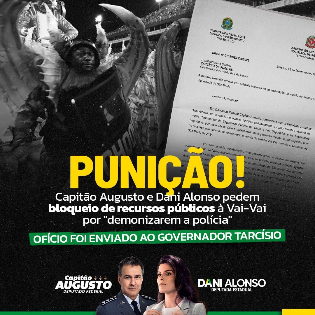 O deputado federal Capitão Augusto e a deputada estadual Dani Alonso, ambos do PL de São Paulo, enviaram ofício ao governador do estado, Tarcísio de Freitas (Republicanos), e ao prefeito da capital, Ricardo Nunes (MDB), pedindo que a escola de samba Vai-Vai fique sem acesso a verbas públicas no próximo ano por “desrespeitar” policiais.