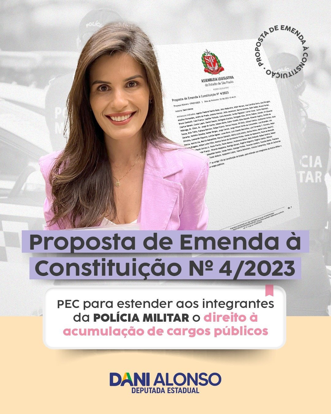 A proposta, de autoria da deputada Dani Alonso, vice-líder do PL na Alesp, trata sobre a acumulação de cargos públicos. Segundo o parágrafo proposto, os integrantes da Polícia Militar poderão acumular cargos militares com cargos de professor, cargos técnicos ou científicos, e cargos ou empregos privativos de profissionais de saúde com profissões regulamentadas, desde que haja compatibilidade de horários e prevaleça a atividade policial militar.