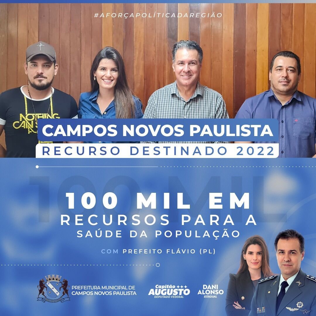 Por intermédio do trabalho que a executiva nacional do PL Dani Alonso vem realizando em todo o Centro Oeste Paulista, o deputado federal, Capitão Augusto, aprovou mais uma emenda, na ordem de R$100 mil, que será destinada ao município de Campos Novos Paulista, contemplando a área da saúde.